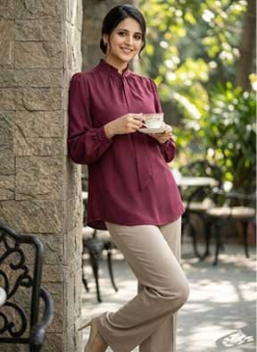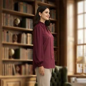 Burgundy High Neck Modest Blouse for Women – Elegant Long Sleeve Top