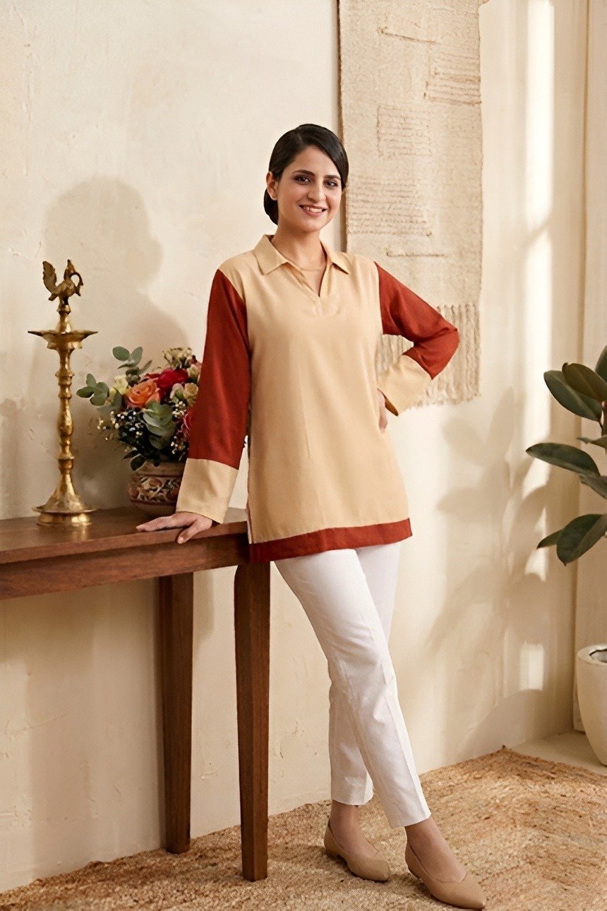Beige & Rust Color Block Tunic for Women – Modest Casual Collared Top