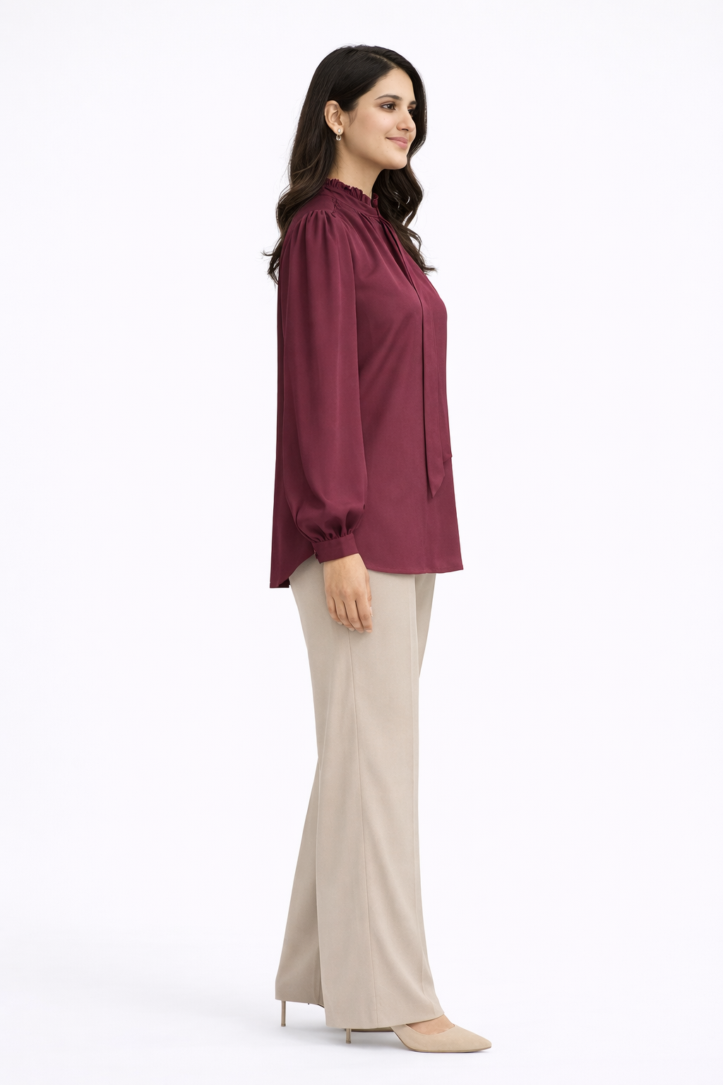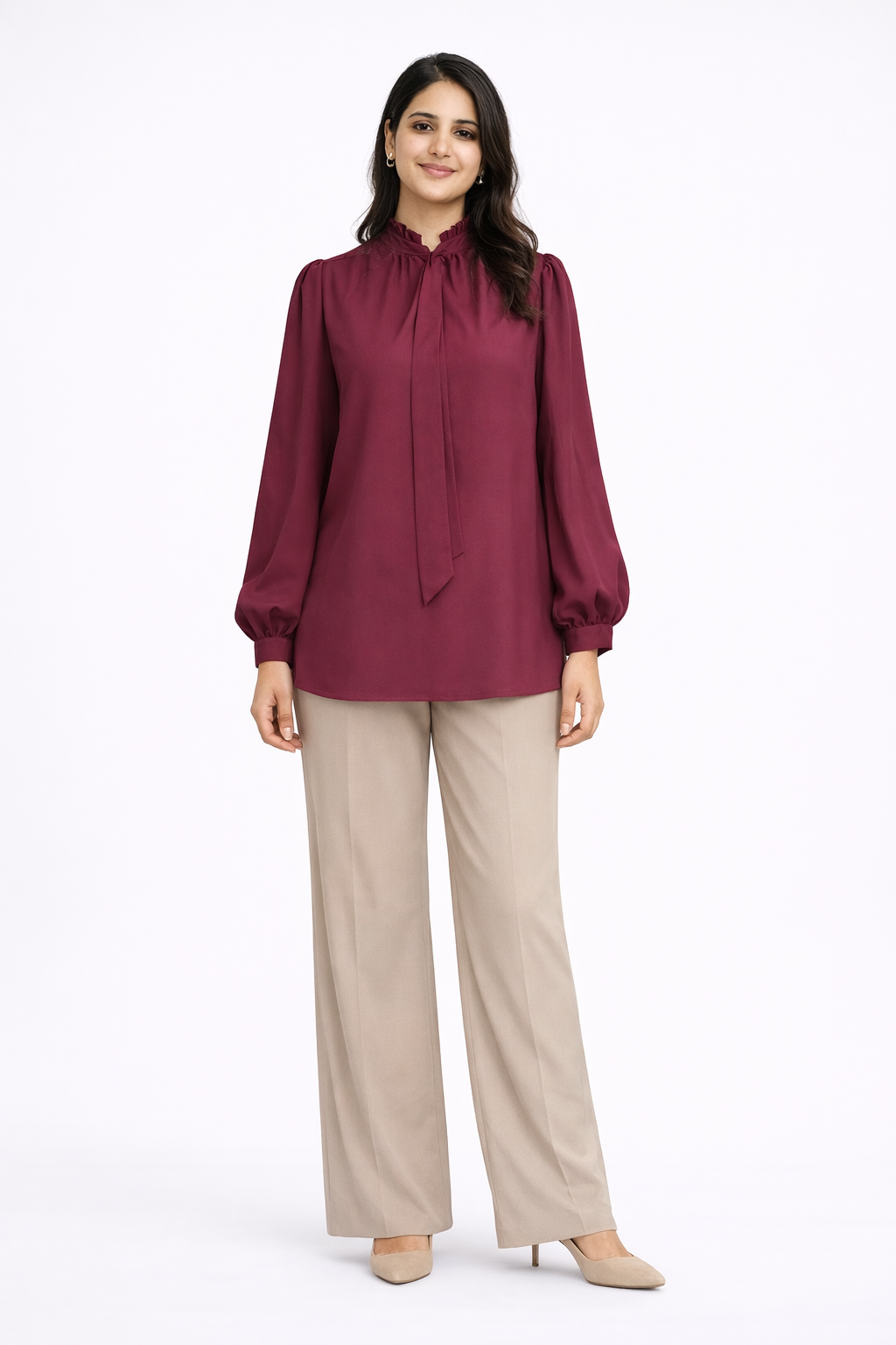 The Burgundy High Neck Modest Blouse is designed for women who appreciate effortless sophistication. Crafted in a rich burgundy tone, this blouse features a soft gathered neckline with subtle tie detailing that enhances its feminine charm while maintaining a modest aesthetic.